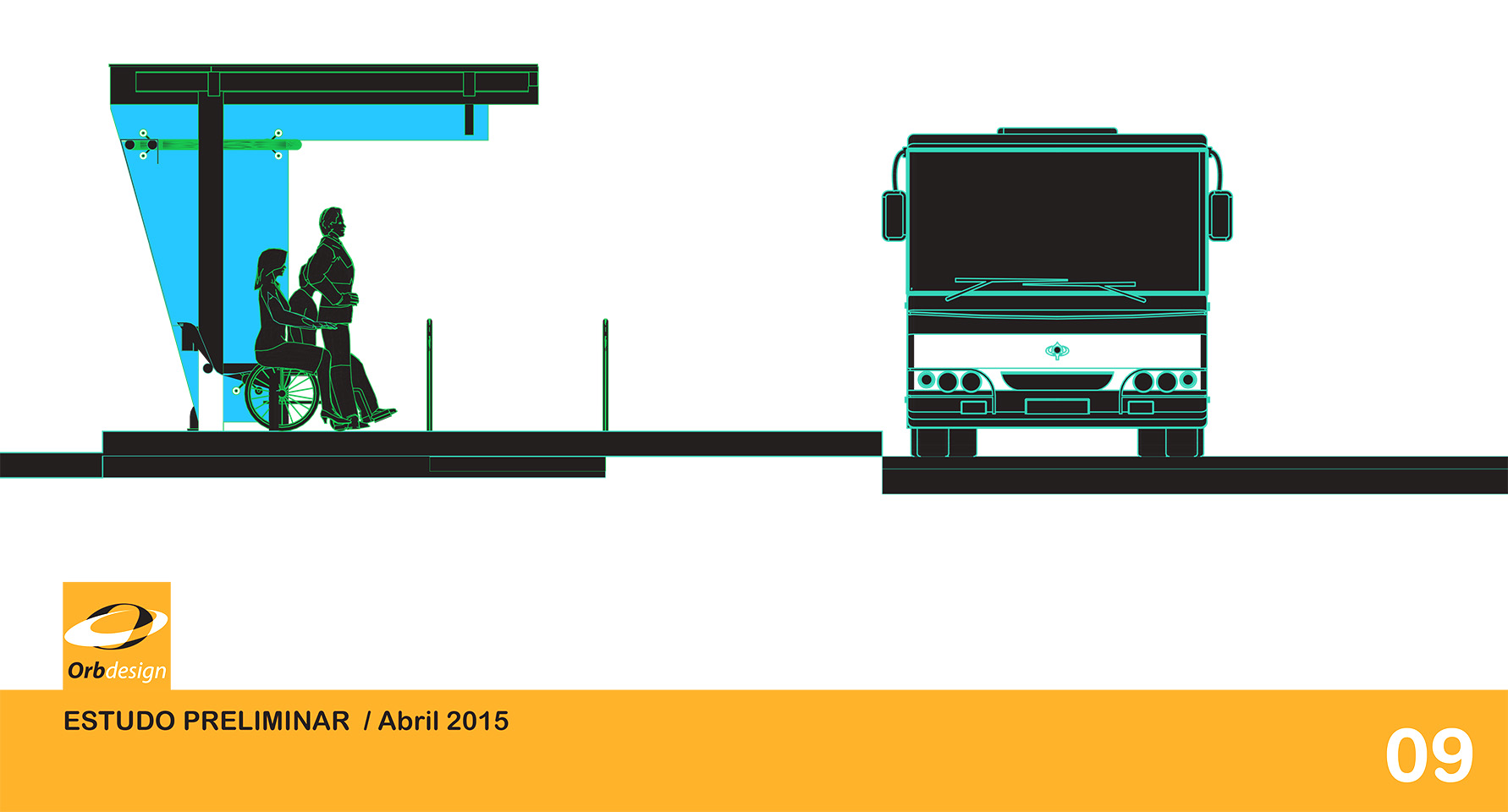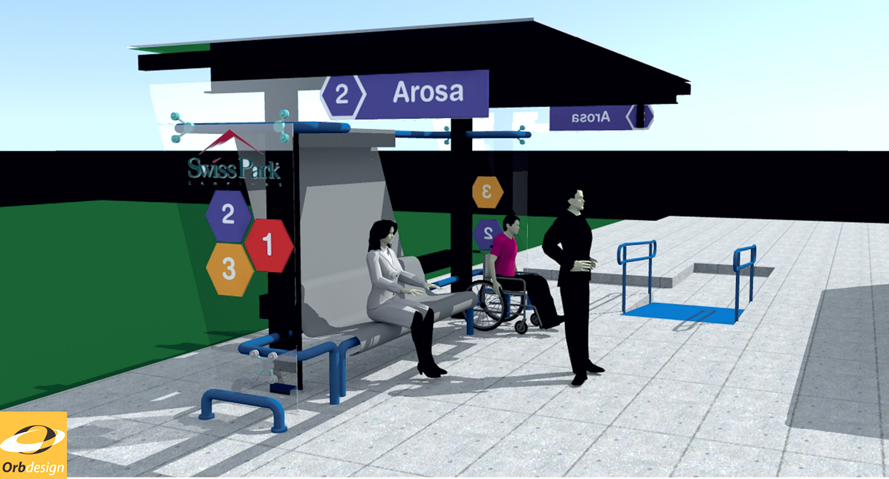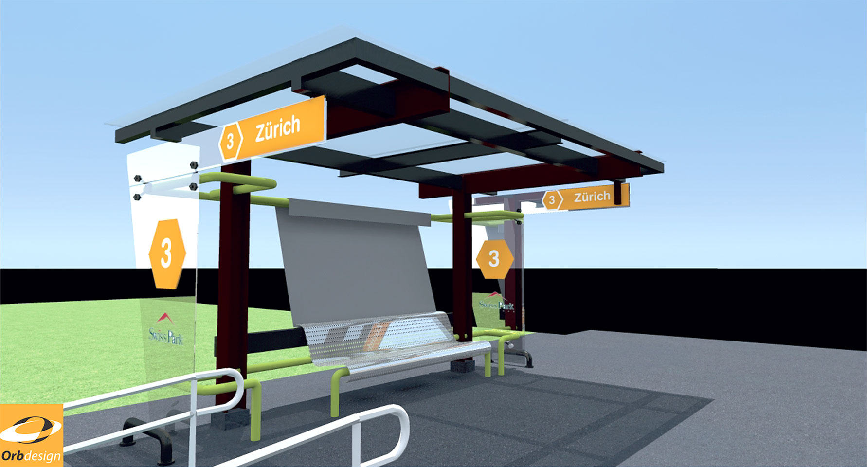 Projeto para abrigo de ônibus para transporte de moradores e funcionários do Swiss Park e todos os seus 16 condomínios. Este abrigo faz parte do sistema de comunicação visual internos ao parque a ser implementado e está em conformidade com as posturas municipais de Campinas / EDEC.